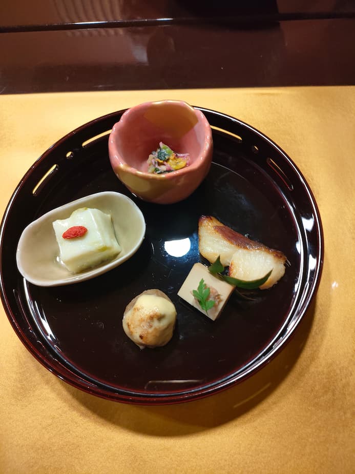 食前酒 梅酒 前菜 カレイの西京焼き・枝豆豆腐・菊しめじ酢みそ・いわしつみれチーズ焼き・燻製豆腐カモペーストのせ