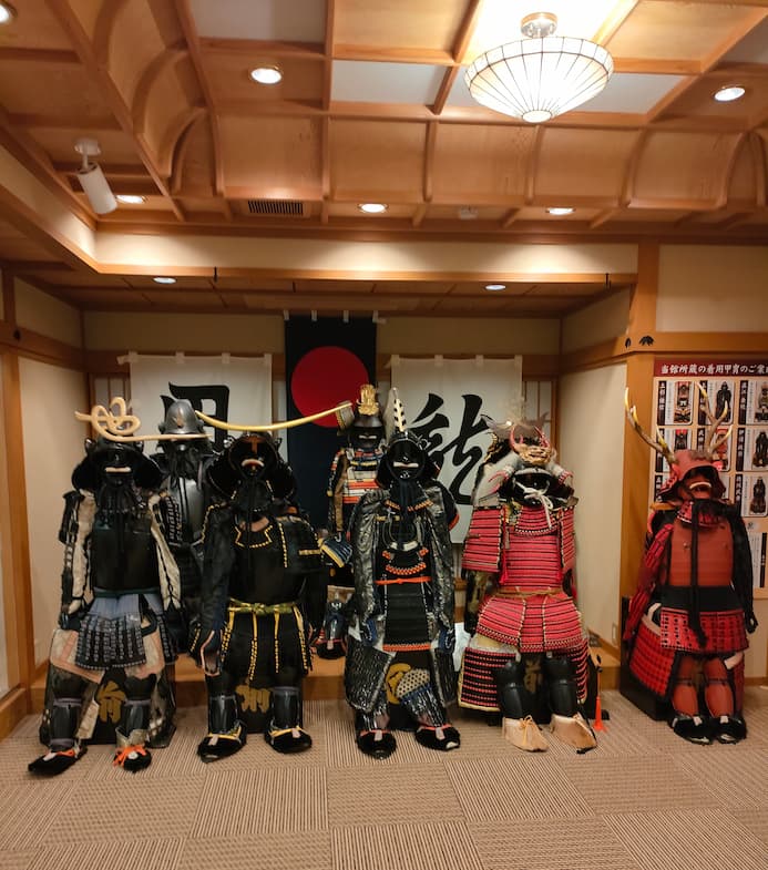 最初は、そんな気なかったけど宿泊客が少ない感じだし、若いカップルが試着して楽しそうだったので、着てみる事に・・・1人では無理で夫に手伝ってもらう。 大変 重たかった 。こんな物をつけて戦っていたのか・・・重すぎる