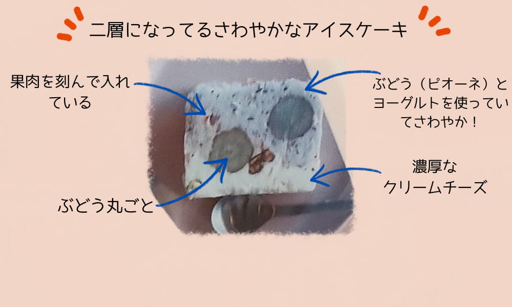 2層になっていて、上はぶどうとヨーグルトを感じられ、みずみずしくて、下はクリームチーズ味がしてとても美味しかったです。