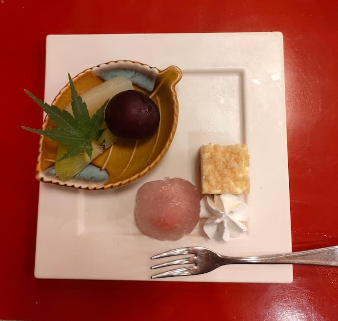 前菜 むかごカステラ 秋刀魚炙り寿司 蒸し栗 青梅流し 千枚大根