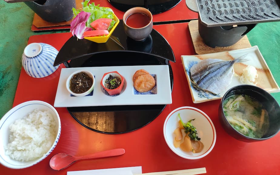 あじの干物は自分で焼きます。 ご飯のおかわりは自分でします。2杯 食べた。