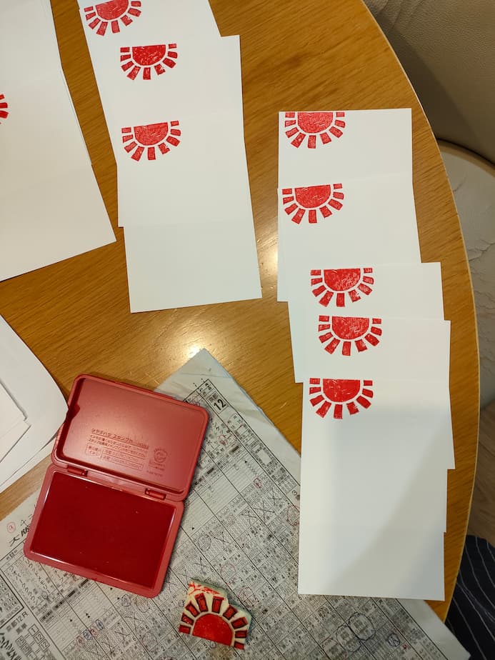 まずは、シャチハタの赤のスタンプで、初日の出のイメージで太陽を!