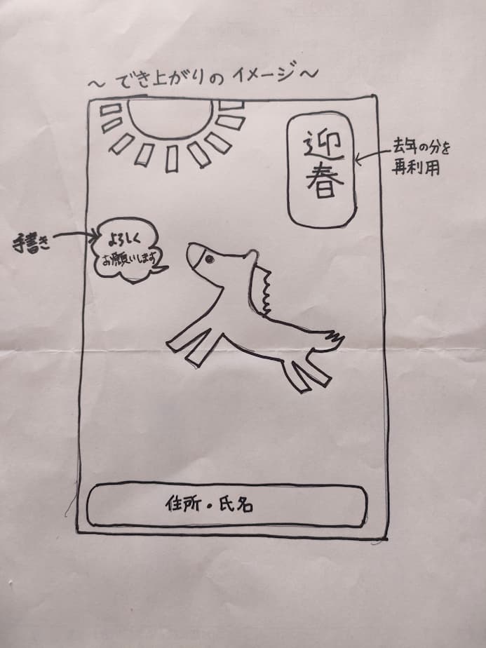 来年(2026年)は午年。けしごむスタンプで年賀状を作りました。